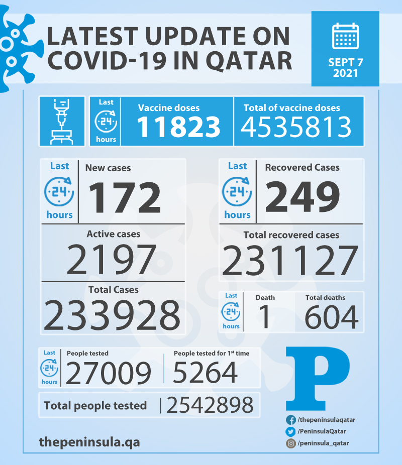 Doha: Ministry of Public Health (MoPH) today reported 172 new cases of coronavirus (Covid-19) and 249 people recovered from the virus in the last 24 hours, bringing the total number of people recovered in Qatar to 231,127.