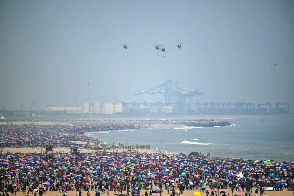 Hundreds of thousands of people gathered along a beach in the blazing sun on Sunday with temperatures hitting 35 degrees Celsius (95 degrees Fahrenheit) at the airforce show in the southern city of Chennai in Tamil Nadu state.