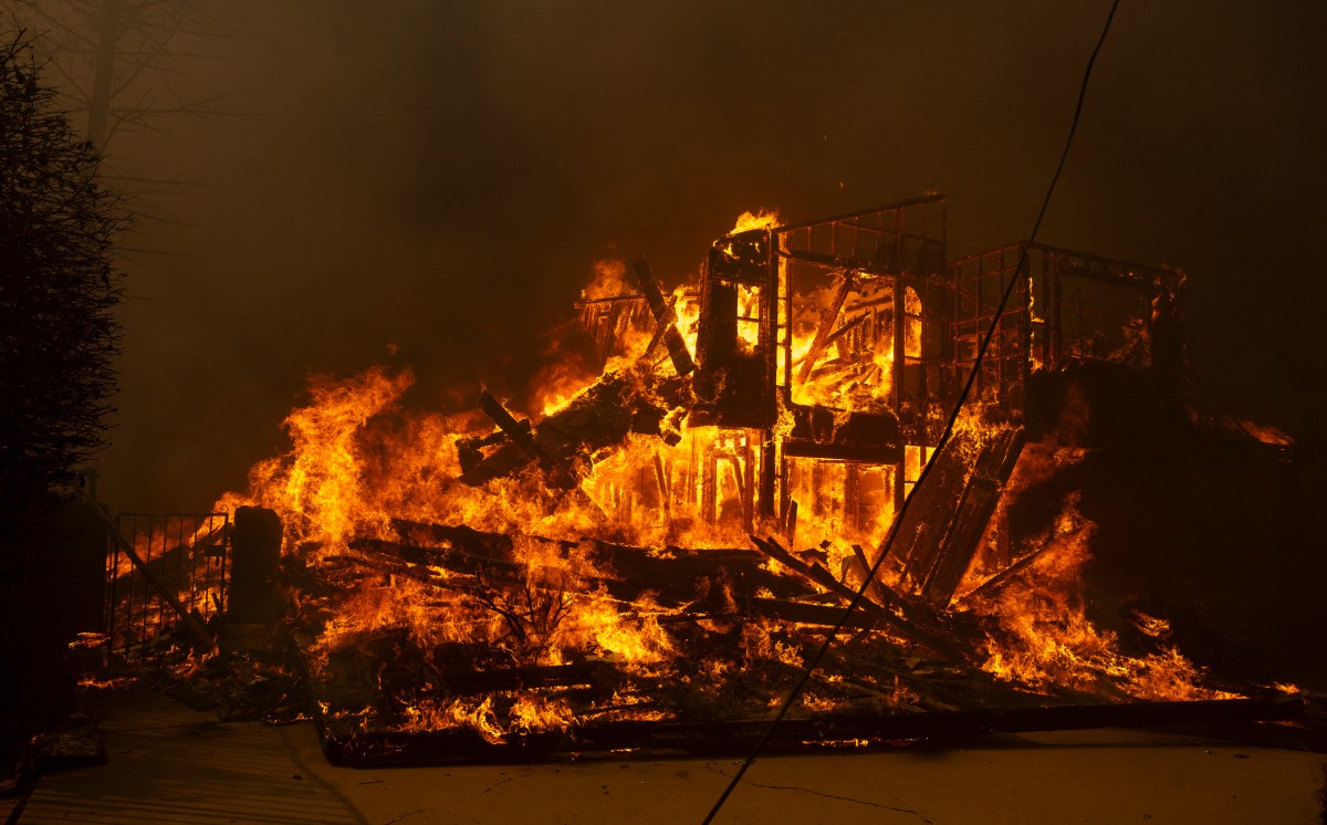 A house is engulfed in the flames of the Mountain Fire as the wildfire scorches acres in Camarillo Heights, Camarillo, California, on November 6, 2024. (Photo by ETIENNE LAURENT / AFP)