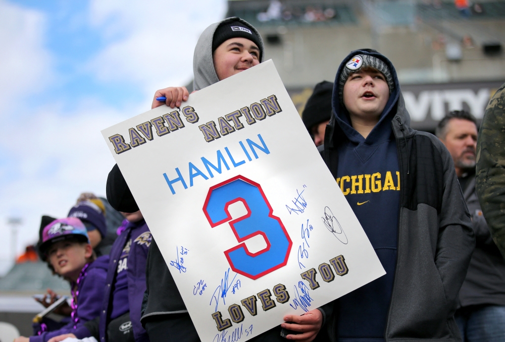 NFL Commissioner Roger Goodell, wearing a "3" hat, "Thank you medical staff", "Love for Damar", "Do it for Hamlin", "Still praying", and "Hamlin Strong" were among the many signs being held up inside the stadium.