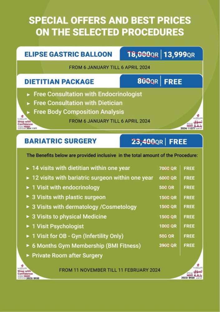 Dr. Al-Adimi added that the services also include a visit to the obstetrician and gynecologist for women with reproductive difficulties for QAR 500 in addition to 6 months at the BMI Fitness Health Club for QAR 3,900, as well as accommodation in a private room after the operation.