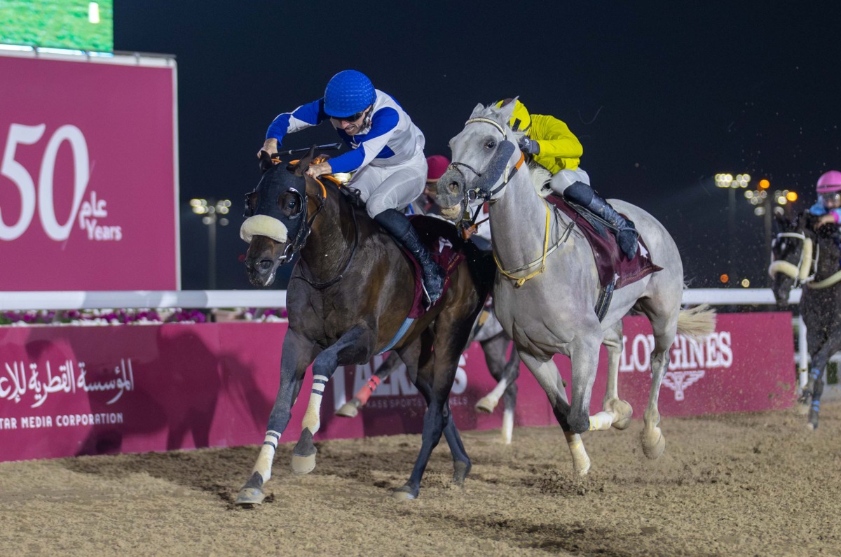 Pierre Charles Boudot steers Al Maqam (left) to a thrilling neck victory in Baidda Algaa Cup race. PICS: Juhaim/QREC