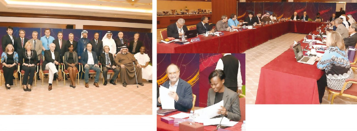 The International Sports Press Association (AIPS)  Executive Committee members pose for a photograph on the opening day of the 79th AIPS Congress in Doha yesterday. The Congress will conclude on Thursday.    Picture by: Adham Elkawas TOP: The Executive Committee Meeting of the 79th AIPS Congress in progress at the Sheraton Hotel in Doha, yesterday. AT LEFT: AIPS President Gianni Merlo (left) and Interim Secretary General Evelyn Watta during the Executive Committee Meeting at the 79th AIPS Congress in Doha yesterday.