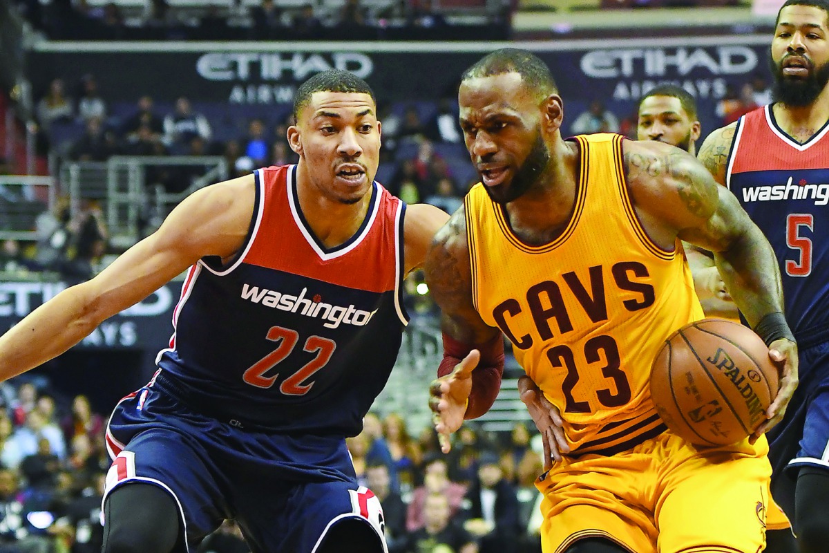 Cleveland Cavaliers forward LeBron James (right) drives to the basket against Washington Wizards forward Otto Porter Jr. during the first quarter of their NBA game at Verizon Center in Washington on Monday.