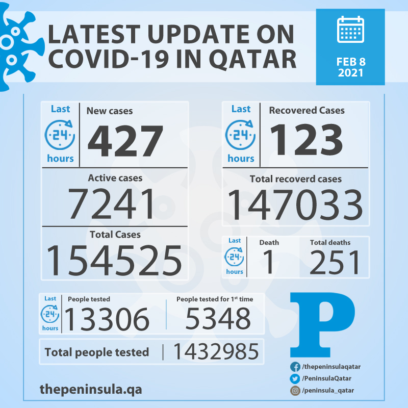 Doha: Ministry of Public Health (MoPH) today reported 427 new cases of coronavirus (Covid-19) and 123 people recovered from the virus in the last 24 hours, bringing the total number of people recovered in Qatar to 147,033.