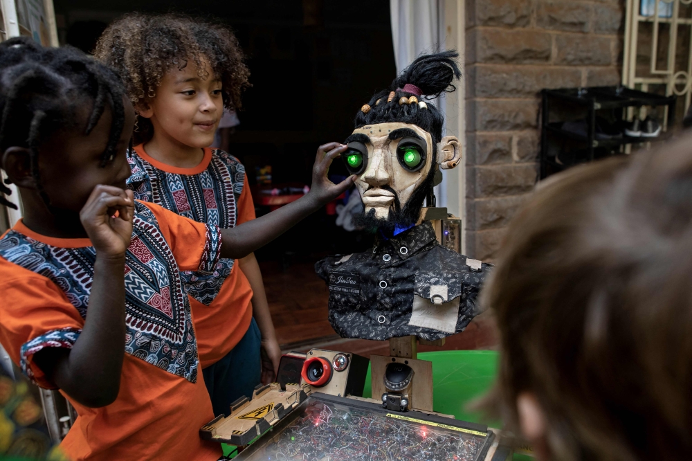Young students react to an interactive robot created by self-taught innovators David Gathu and Moses Kiuna, made and operated using salvaged electrical components, mechanical parts, plywood and rubber bits, at the Jasiri Mugumo school in Nairobi on January 31, 2023