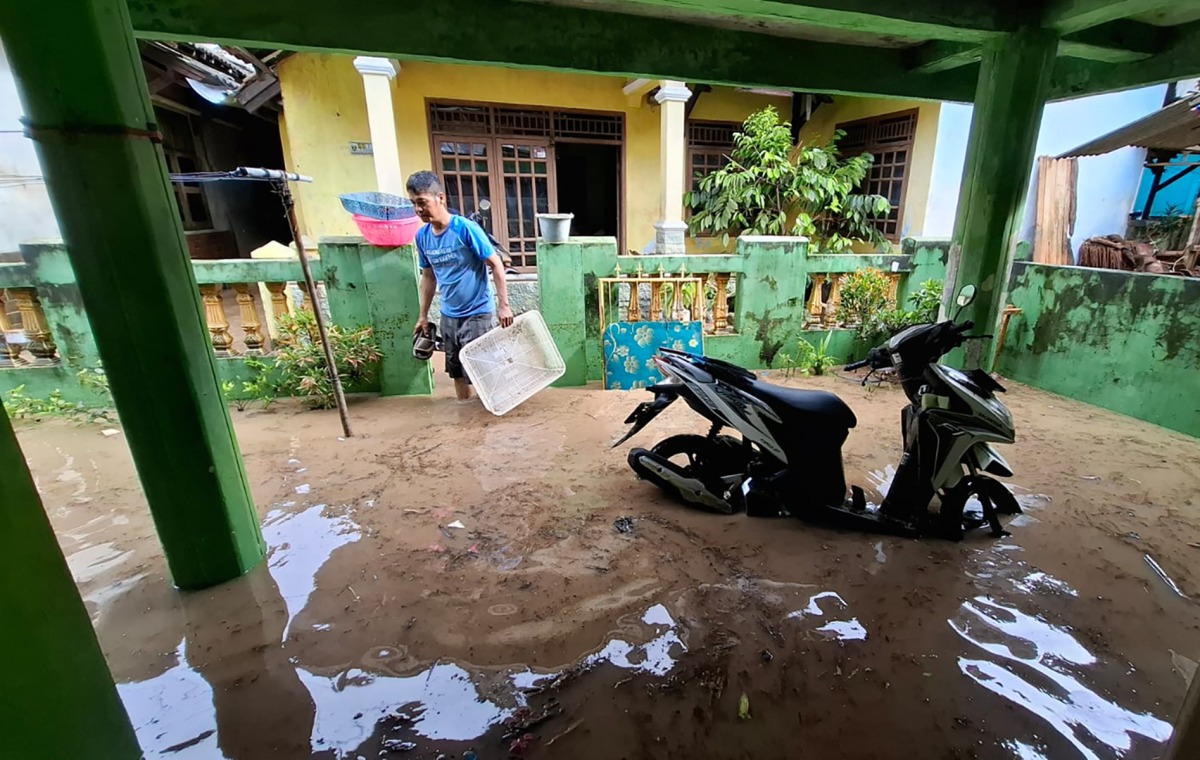 This photo taken with a mobile phone shows a man walking through floodwater in a residential area in Sukabumi Regency, West Java, Indonesia, March 7, 2025. (Photo by Adrian/Xinhua)