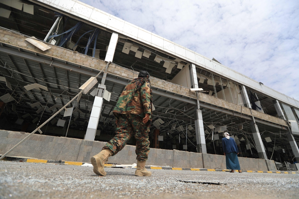 A Yemeni soldier inspects the damage at the Sanaa International Airport on May 7, 2025. (Photo by Mohammed Huwais / AFP)