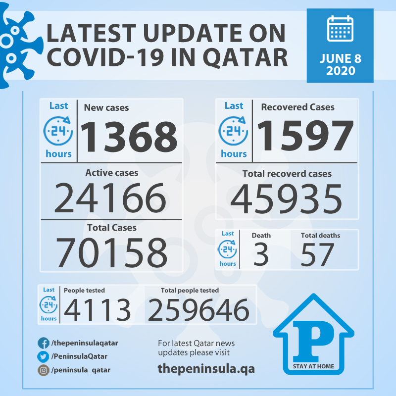 The total number of positive COVID-19 cases recorded in Qatar till now stands at 70158 and there are 24166 active cases under treatment. So far, 57 people died from the coronavirus in Qatar. Ministry conducted 4113 tests in last 24 hours taking the total tests done so far to 259646 tests.
