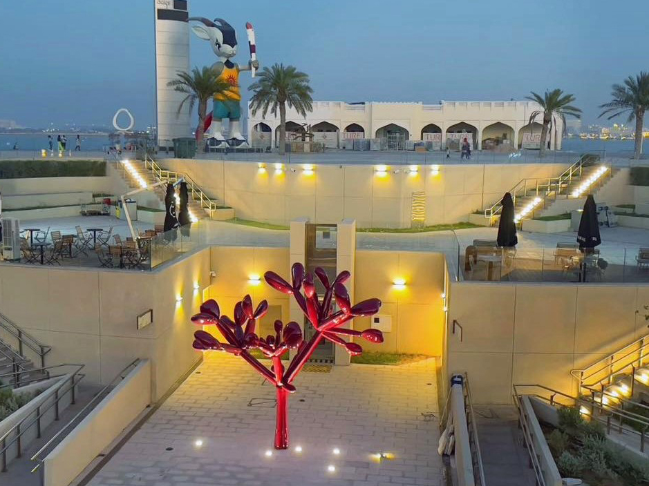 The 5m x 5m stainless steel sculpture, designed to match the colour of the Qatari flag, represents a local perennial plant from the succulent family.