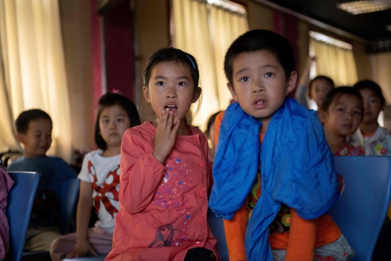 Behind the screen, puppeteers use rods to move the figures, to the joy of the schoolchildren watching.