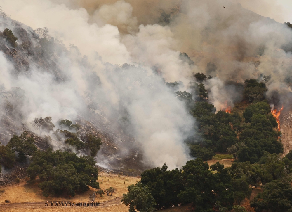 Firefighters work to contain the Lake Fire burning in Los Padres National Forest with evacuation warnings in the area on July 6, 2024 near Los Olivos, California. (Photo by Mario Tama/Getty Images/AFP)