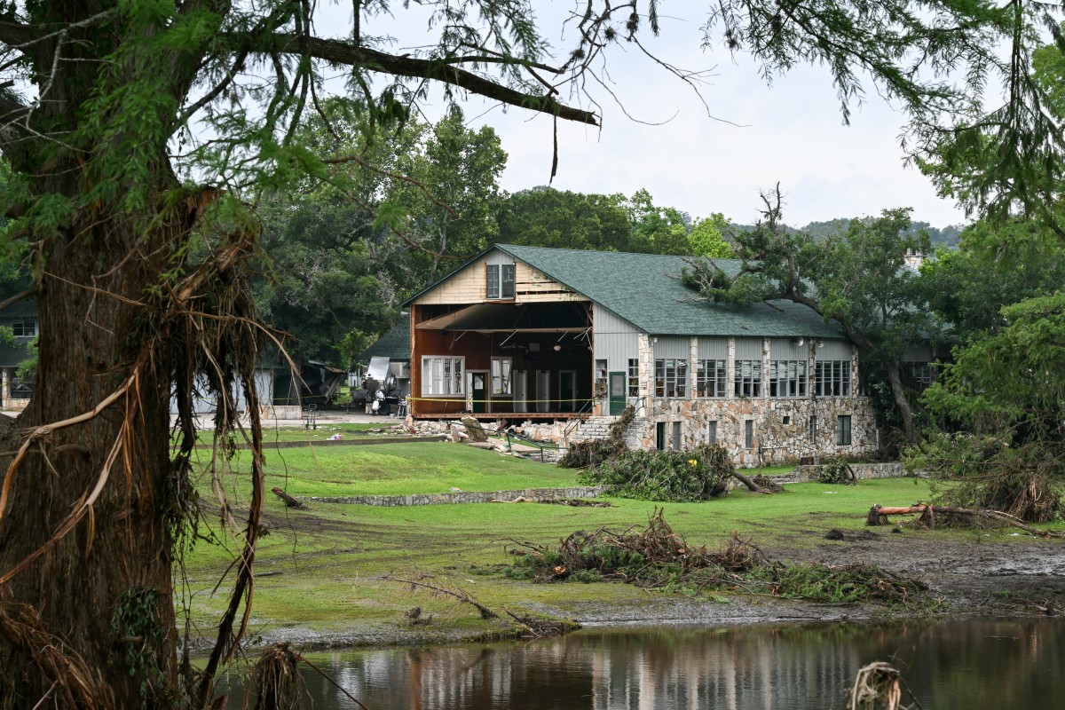 A view of a damaged building and fallen trees at Camp Mystic in Hunt, Texas, on July 7, 2025, following severe flash flooding that occurred during the July 4 holiday weekend. Photo by Ronaldo Schemidt/AFP