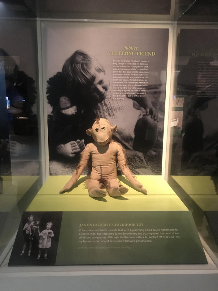 Goodall's first recorded encounter with a chimp goes way back - before the conservationist could even walk. Growing up in England, Goodall's favorite childhood toy was a stuffed chimpanzee that she received as a first birthday gift from her father in 1935. Named Jubilee in honor of King George V's silver jubilee - or 25 years on the throne - the stuffed animal also commemorated the birth of a chimpanzee at the London Zoo that year. It was one of many childhood keepsakes she held on to throughout her adult life. "Jane was always Jane," says Keane. "She was born with this incredible curiosity, incredible bravery and desire to explore the world that was so obvious, even at such an early age. It seemed predestined for her to do what she did." Goodall was also a voracious reader who owned an extensive collection of books, including "Tarzan of the Apes" and "The Story of Doctor Dolittle," both of which are on display here, in addition to photos from her family album.