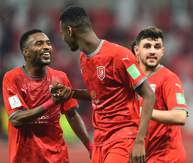 Al Duhail's Mohammed Muntari celebrates with team-mates after scoring their second goal against Ulsan Hyundai during their FIFA Club World Cup Qatar 2020 Fifth Place Play-off at Ahmad Bin Ali Stadium on Sunday. PICTURES: ANVAR SADATH
