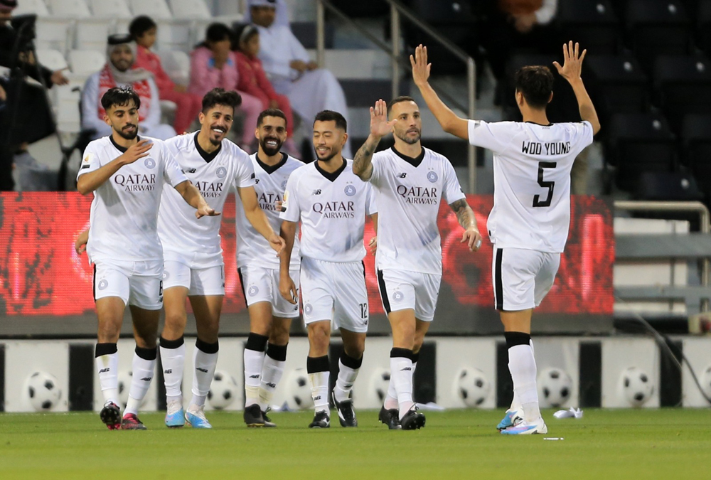 Al Sadd's players celebrate after Baghdad Bounedjah scored their second goal against Al Arabi, on Thursday.