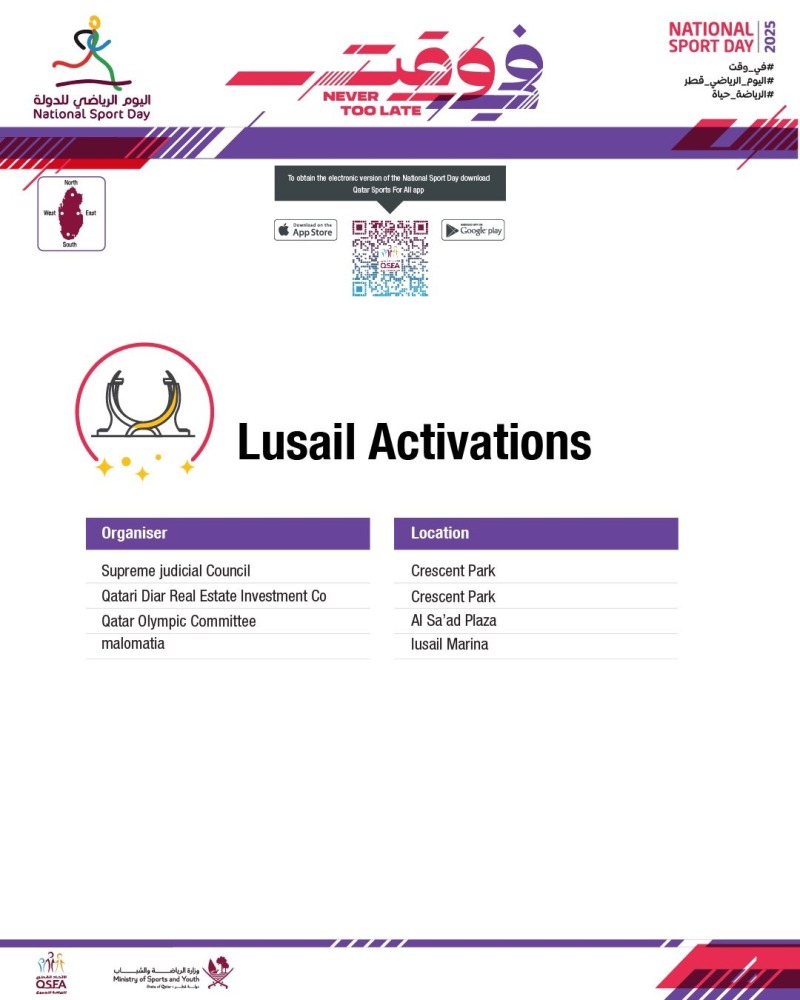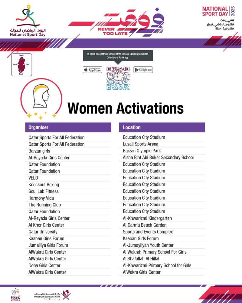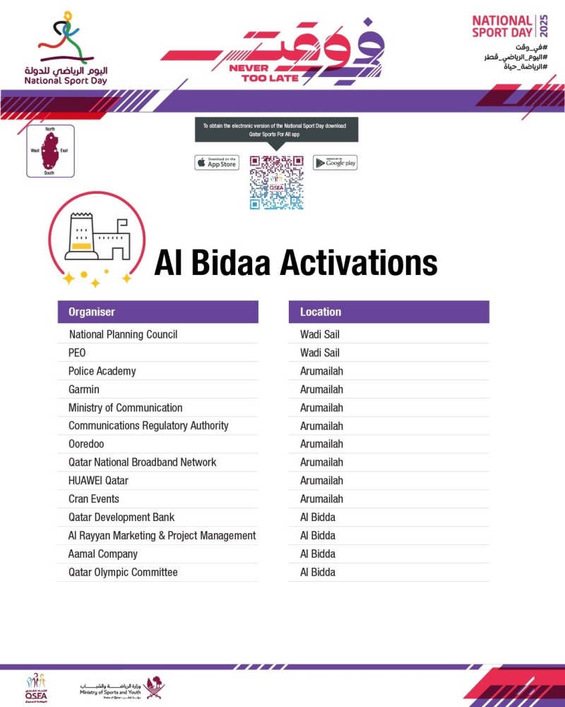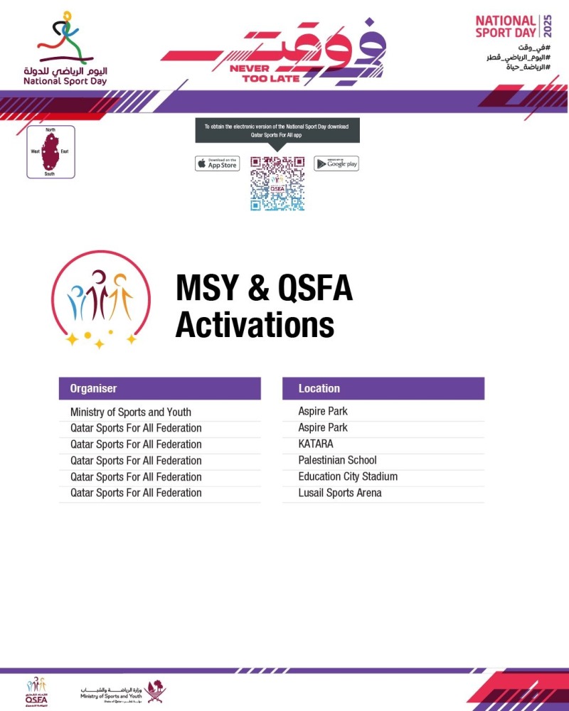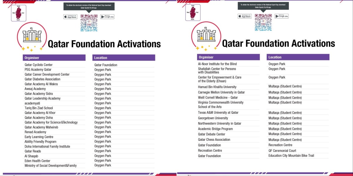 Here are the lists of activations scheduled for Qatar National Sport Day throughout the country: