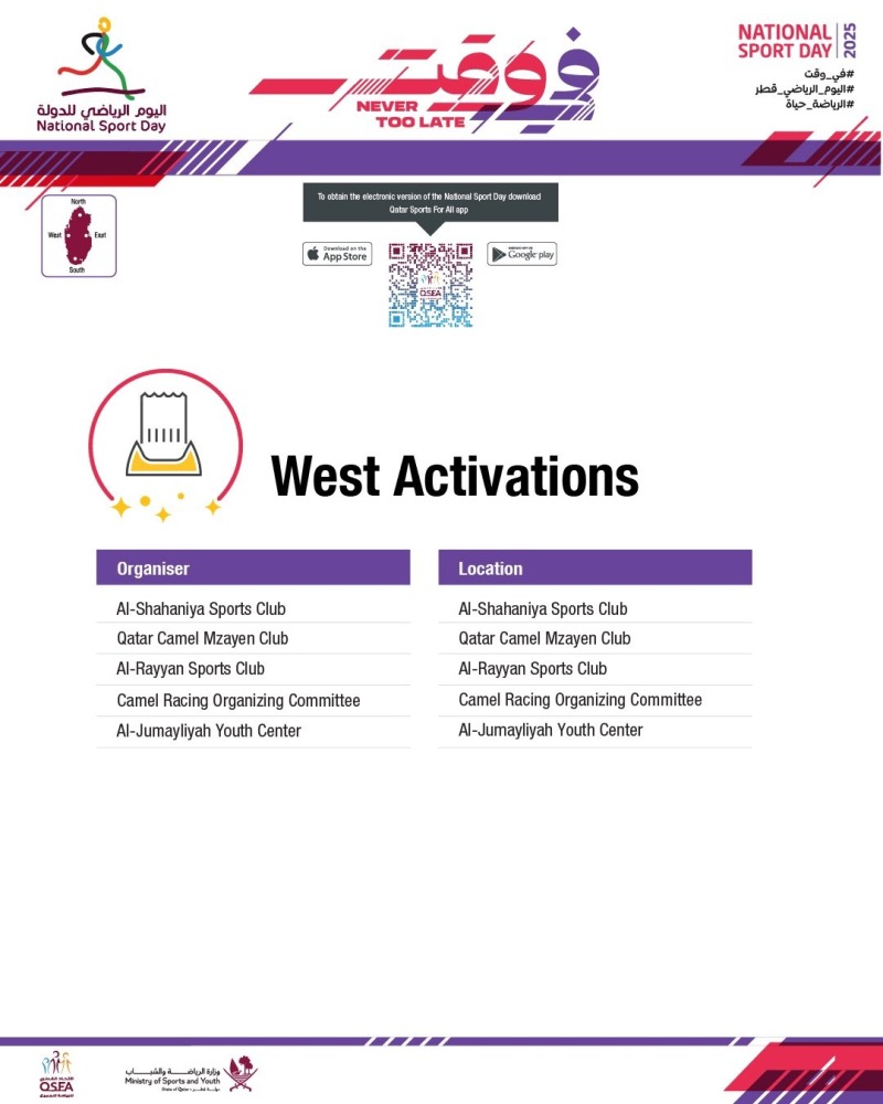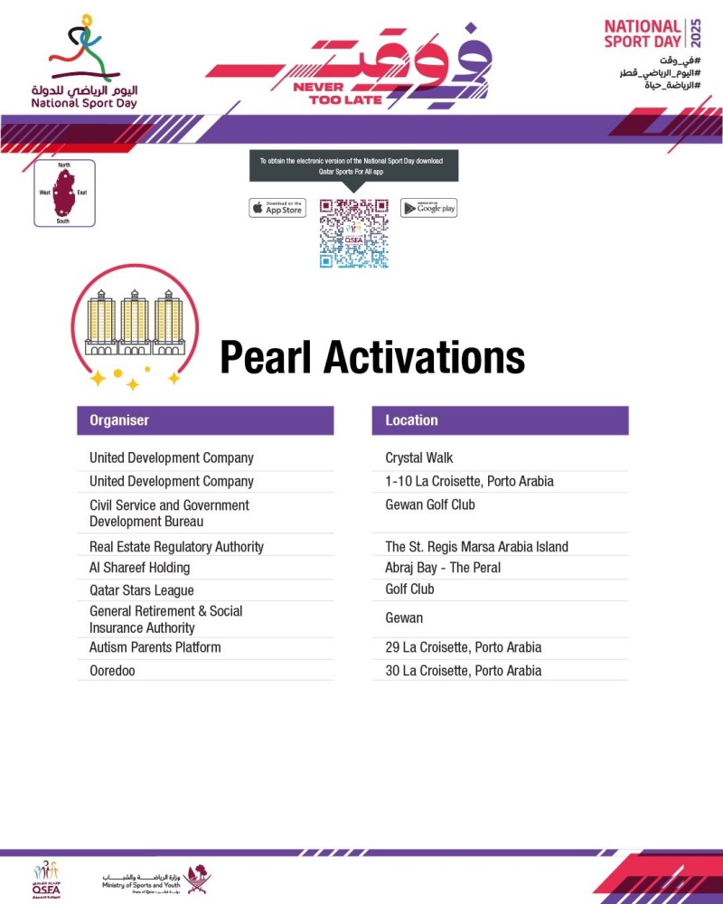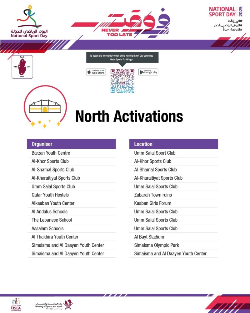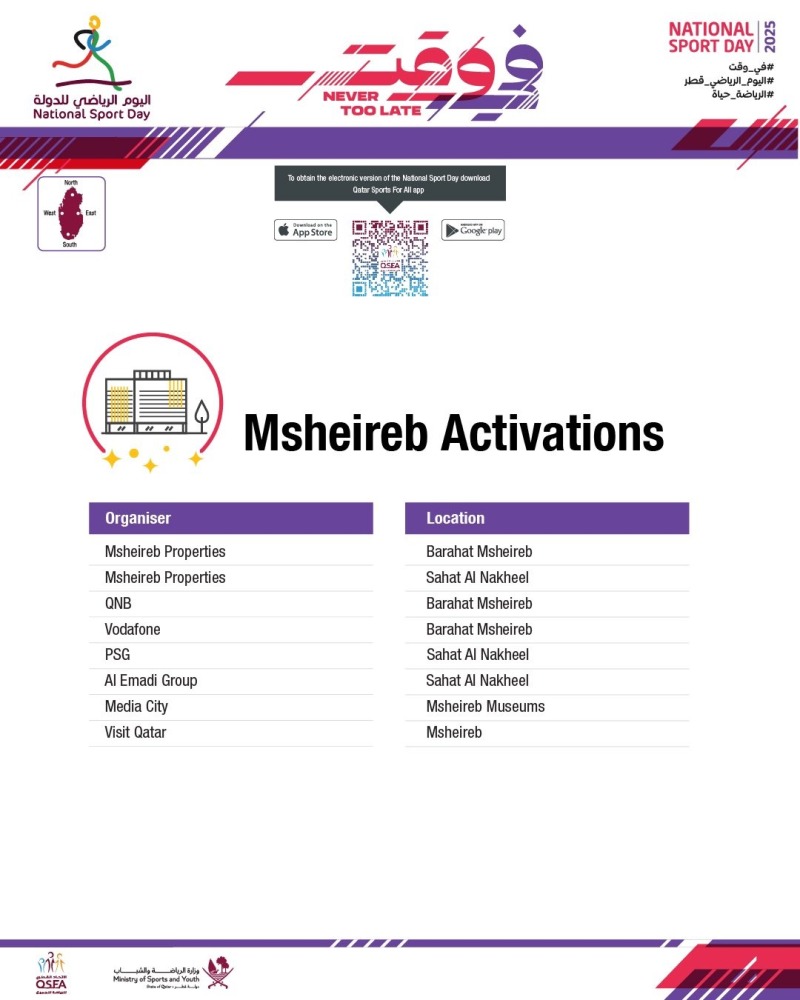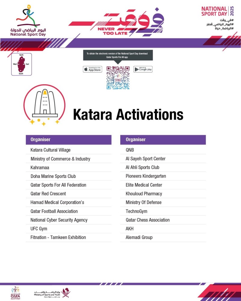 Here are the lists of activations scheduled for Qatar National Sport Day throughout the country: