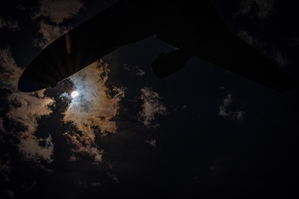 A plane flies past the partial solar eclipse at Gravelly Point Park on April 8, 2024 in Arlington, Virginia. (Photo by Andrew Harnik / GETTY IMAGES NORTH AMERICA / Getty Images via AFP)
