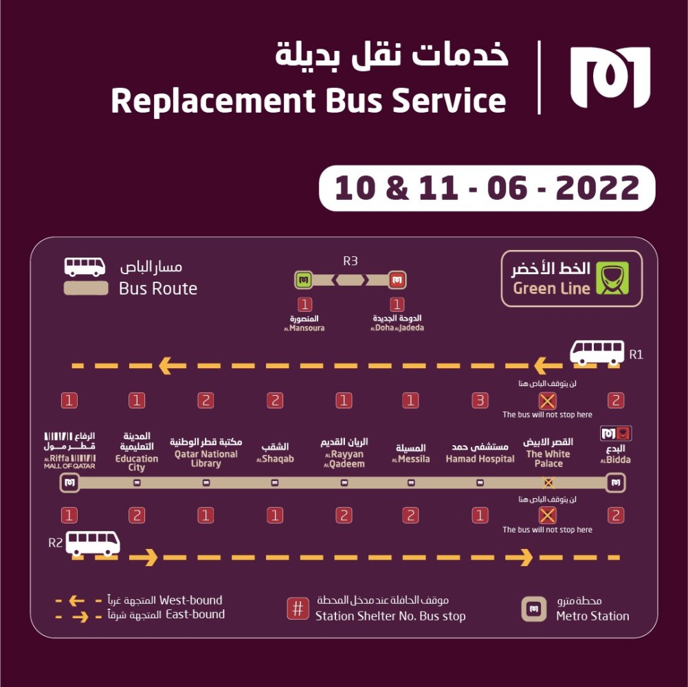 Doha: On Friday-Saturday, June 10 and 11, 2022, Doha Metro services on Green Line will be replaced with alternative services. Metrolink will operate as normal.