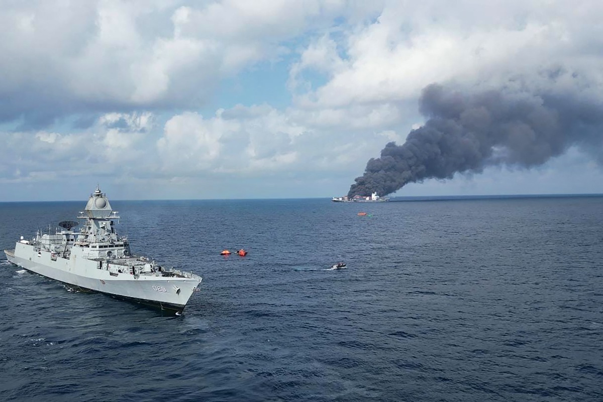 New Delhi: India deployed coast guard aircraft and a warship on Monday after a Singapore-flagged container ship caught fire off the southern coast, the defence ministry said, with four crew members missing.