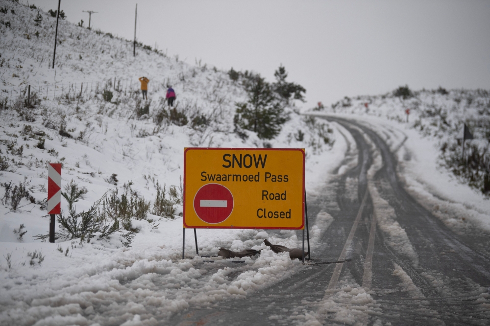 A general view of a road-closure sign on the Bo-Swaarmoed Pass, after an unusually heavy snowfall on the mountains in the area, near Ceres on July 8, 2024. Two cold fronts have hit South Africa in the past two days resulting in snowfall in Western Cape. (Photo by RODGER BOSCH / AFP)