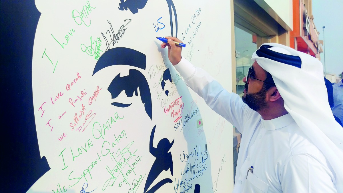 The ‘Tamim Al Majd’ mural is on display at the Jumbo Electronics showroom located at Barwa Village for customers who visit the outlet to leave a message on the mural as a sign of support.