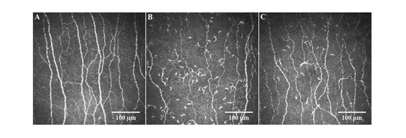 Crucially, nerve damage observed in the corneas using CCM can be reliably used as an indicator of nerve damage in other parts of the body. CCM’s value as a diagnostic tool is increased by a number of important factors: the test takes only a few minutes, is completely non-invasive, causes almost no discomfort for patients, utilizes existing and widely available ophthalmic equipment, and can be done in the clinic.