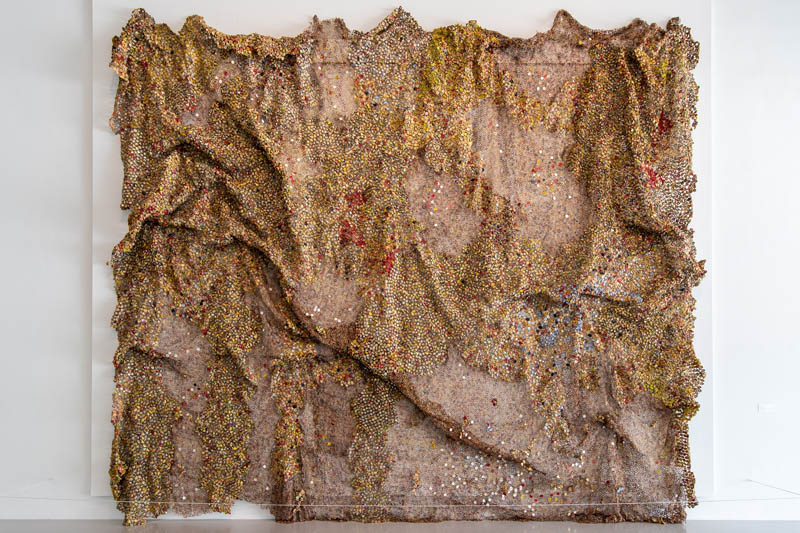 The artist generates meaning out of his material and technical process. For example, the bottle caps come from hard liquors introduced by Europeans as currency - and thus a means of subjugation - during the era of transatlantic slavery and colonisation. The process of cutting, flattening, squeezing, twisting, folding and stitching together with copper wire thousands of these bottle caps into a single work, speaks to the making of human communities out of connected individual subjectivities.