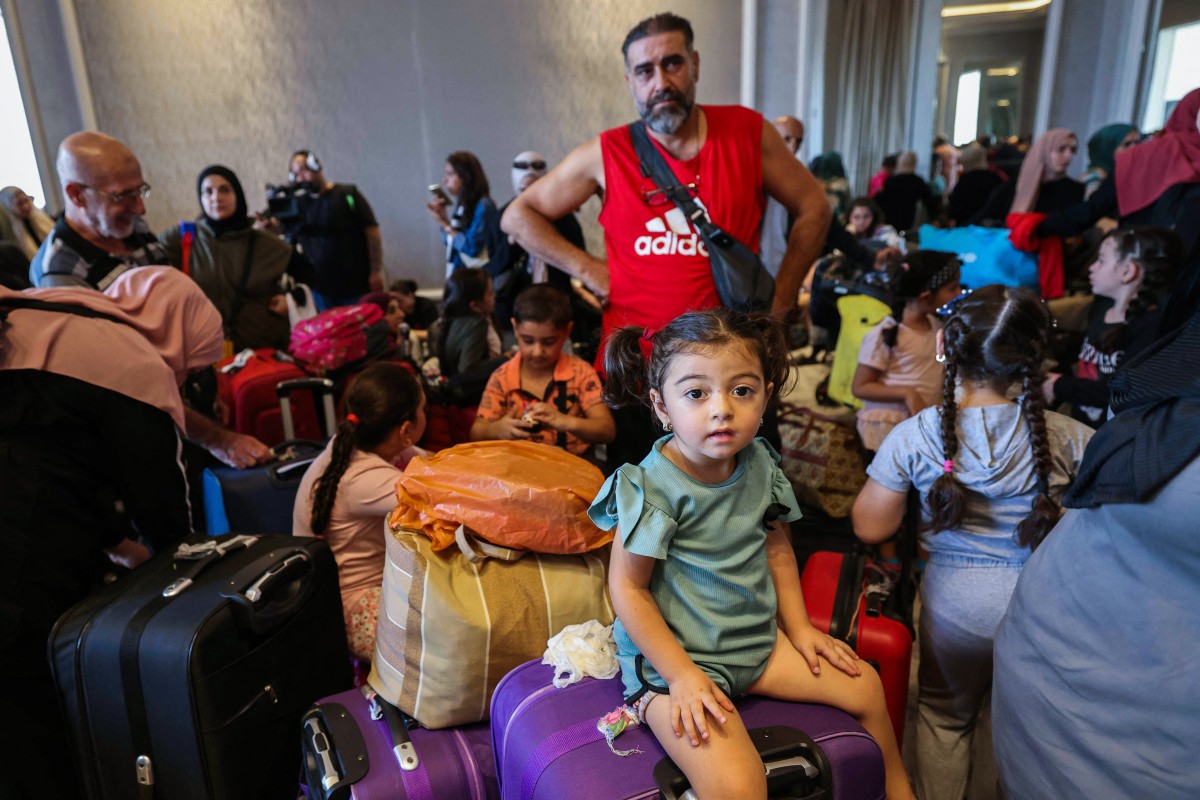 Turkish passport holders await resgistration at a hotel in the BIEL area of Beirut's waterfront, ahead of their evacuation from Israeli bombing of Lebanon on Turkish Navy ships from the Beirut port on October 9, 2024. Photo by Anwar AMRO / AFP.