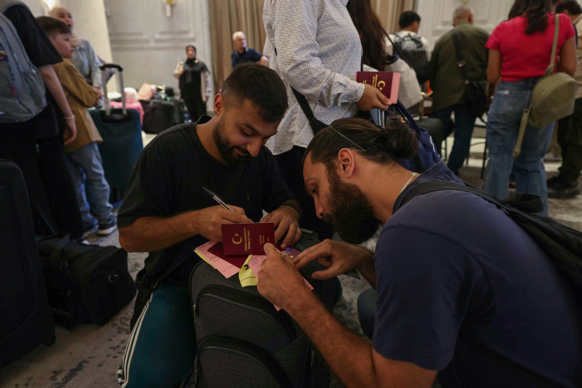 Turkish passport holders register at a hotel in the BIEL area of Beirut's waterfront, ahead of their evacuation from Israeli bombardment of Lebanon on Turkish Navy ships from the Beirut port on October 9, 2024. Photo by Anwar AMRO / AFP.