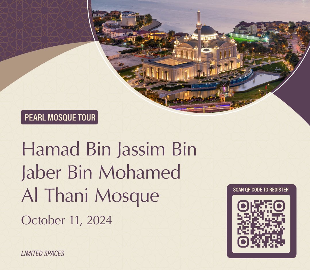 Join a tour of the Hamad Bin Jassim Bin Jaber Bin Mohamed Al Thani Mosque. Inaugurated in December 2023 at The Pearl Island, this stunning addition to Qatar's architectural heritage showcases the country's first New Baroque architectural style. Its unique design features intricate hand-painted decorations and calligraphy. All are welcome, but must register asap as spaces are limited. Scan the code or click here to reserve your spot.