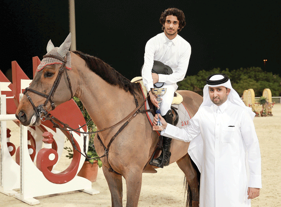 Sheikh Mohamed bin Nasser Al Thani giving trophy to the class 2 winner in the Second National Show Jumping competitions held at the Indoor Arena at Qatar Equestrian Federation (QEF) in Doha. Mohammed Abdulla Saeed guided Toberlina T to victory in the 115cm class. Khalid Hamad Al Attiya, astride Levicci, topped the field in 125cm class. Salmin Sultan Al Suwaidi guided Lucrate D’Eau Grenou to victory in the 135cm class (one round with jump-off). MUSTAFA PATTAMBI