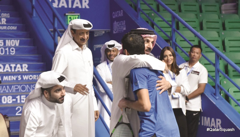 Qatar’s Abdulla Al Tamimi celebrates his win over Gregoire Marche of France at the PSA Men’s World Championshipat the Khalifa International Tennis and Squash Complex yesterday.