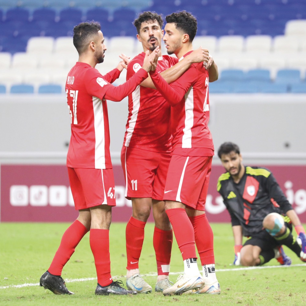 Suhaib Gannan (right) celebrates with teammates after scoring Al Shamal's third goal.