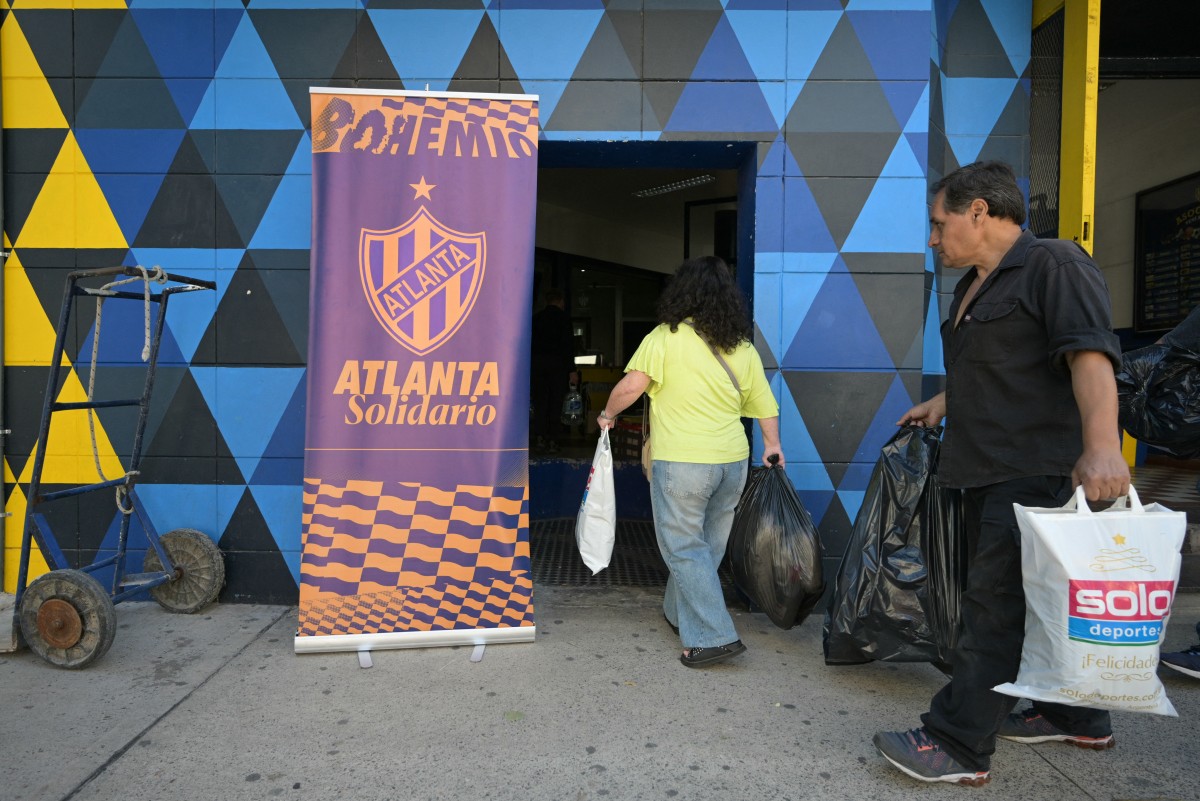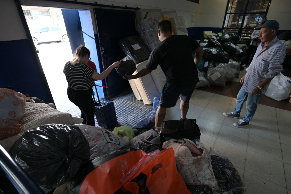 A man receives donations for people affected by severe flooding in Bahia Blanca, at Club Atletico Atlanta in Buenos Aires on March 10, 2025. (Photo by JUAN MABROMATA / AFP)