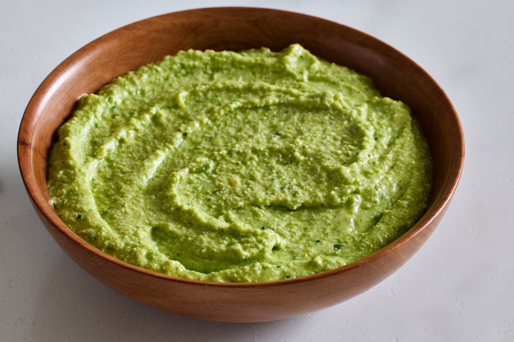 To make the whip, just whir feta, peas, parsley, a dollop of yogurt, lemon zest and juice, and a small garlic clove in a food processor, and drizzle in olive oil until you have a thick spread. The peas and parsley impart a pastel-green hue, and the lemon infuses the spread with its sunny flavor. You can use either fresh peas, which have been cooked until tender, or frozen peas defrosted and cooked according to the instructions on the package, then allowed to cool a bit.