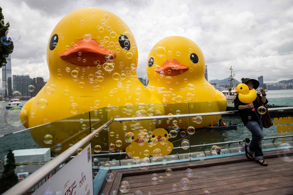 The two 18-meter-tall yellow ducks by Dutch artist Florentijn Hofman resemble the bath toys many played with in their childhood. Shortly after their launch, dozens of residents and tourists flocked to the promenade near the government headquarters in Admiralty to snap photos of the ducks.