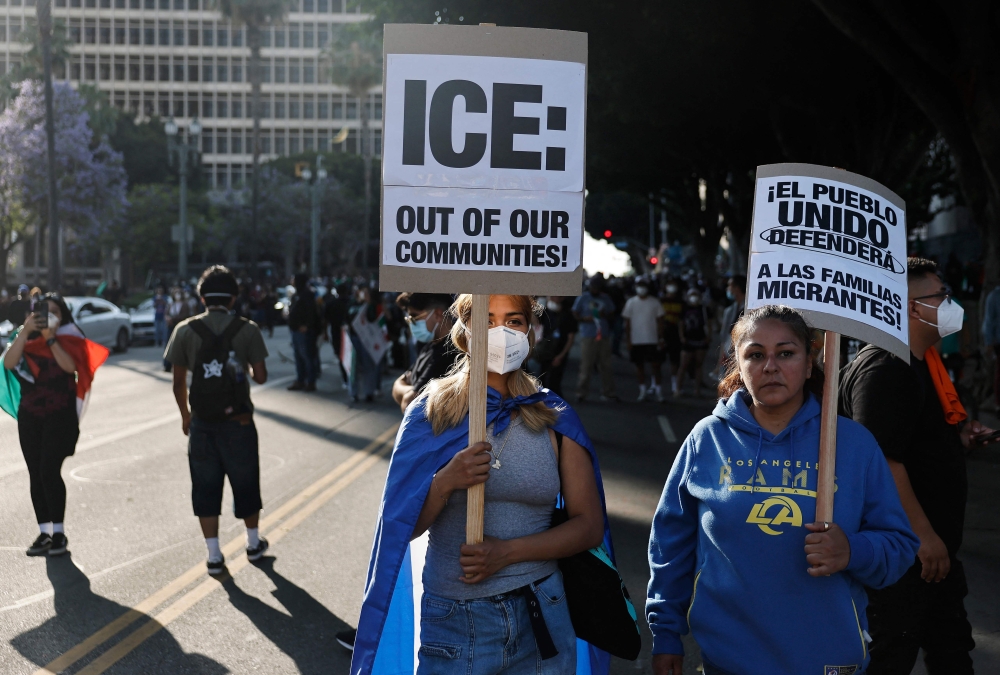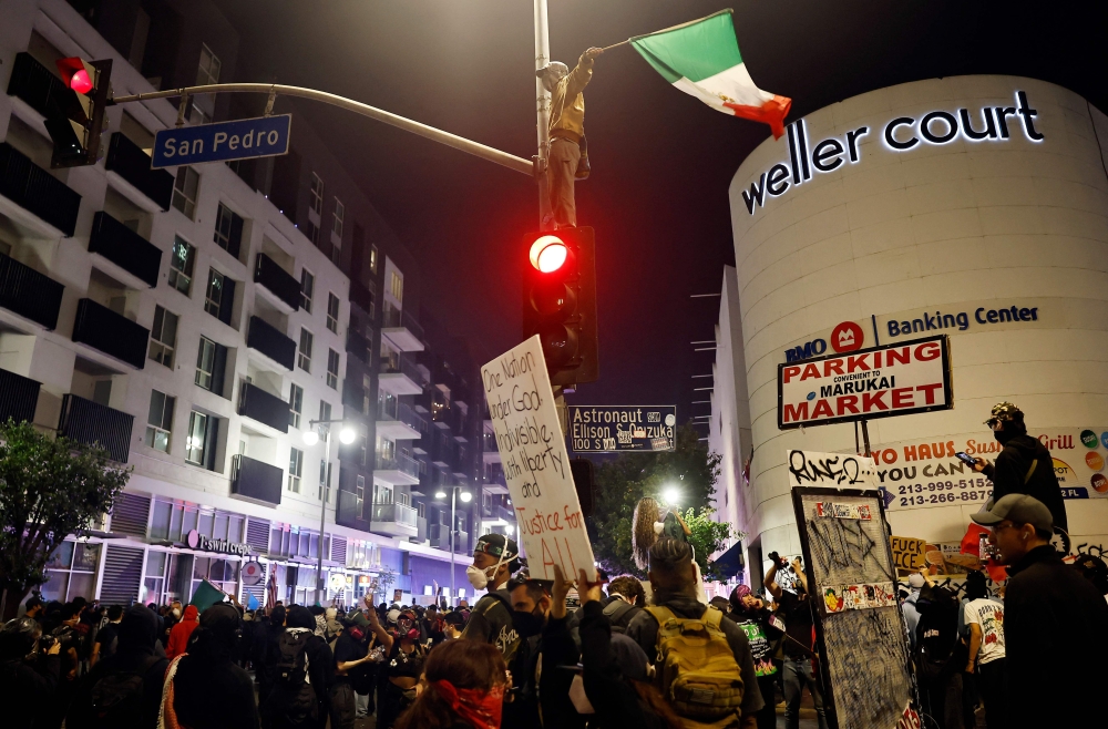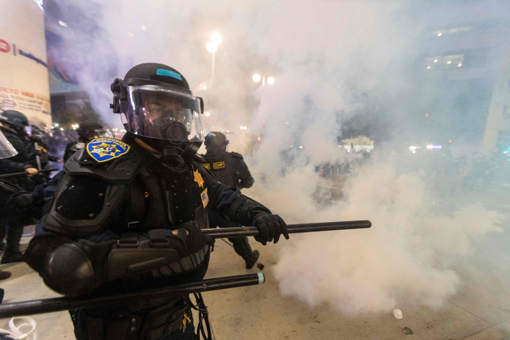 In the nearby city of Santa Ana, about 32 miles (50 kilometers) southwest of Los Angeles, law enforcement fired tear gas and flash-bang grenades on protesters chanting against the Immigration and Customs Enforcement (ICE) agency as darkness fell.