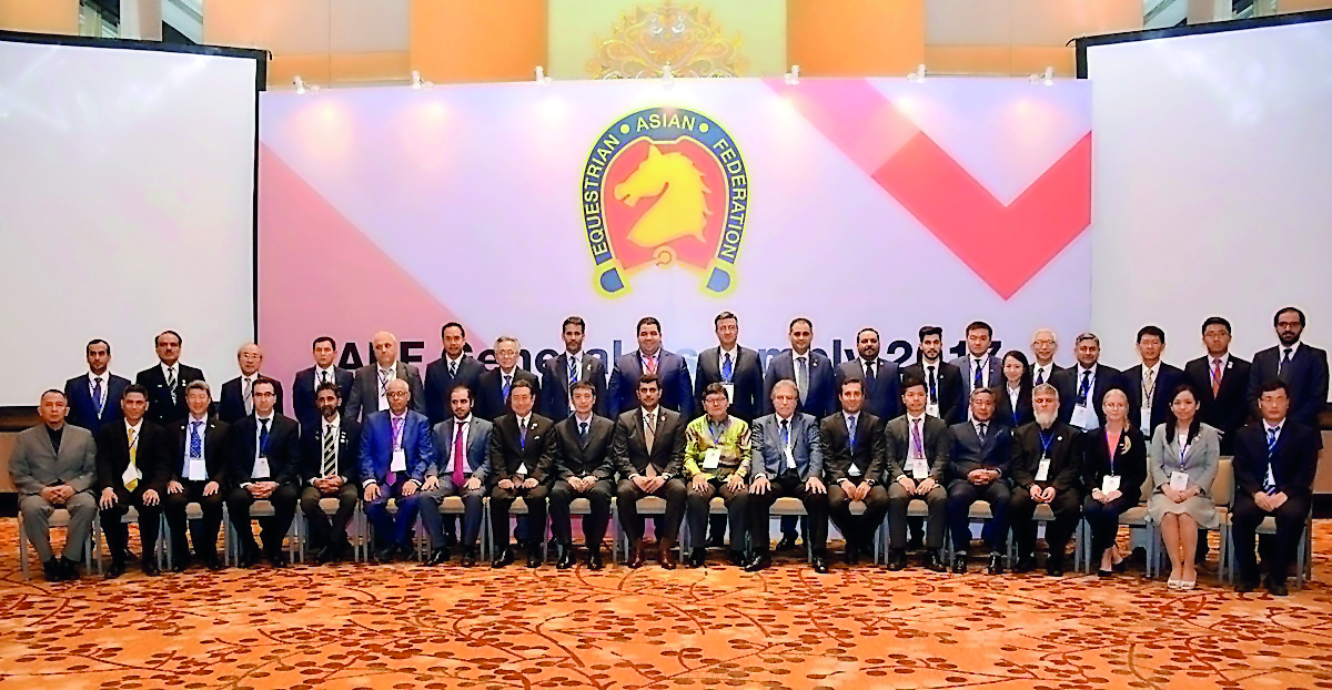 The newly elected office bearers and members of the Asian Equestrian Federation pose for a photograph during the general assembly held in Jakarta, Indonesia yesterday.