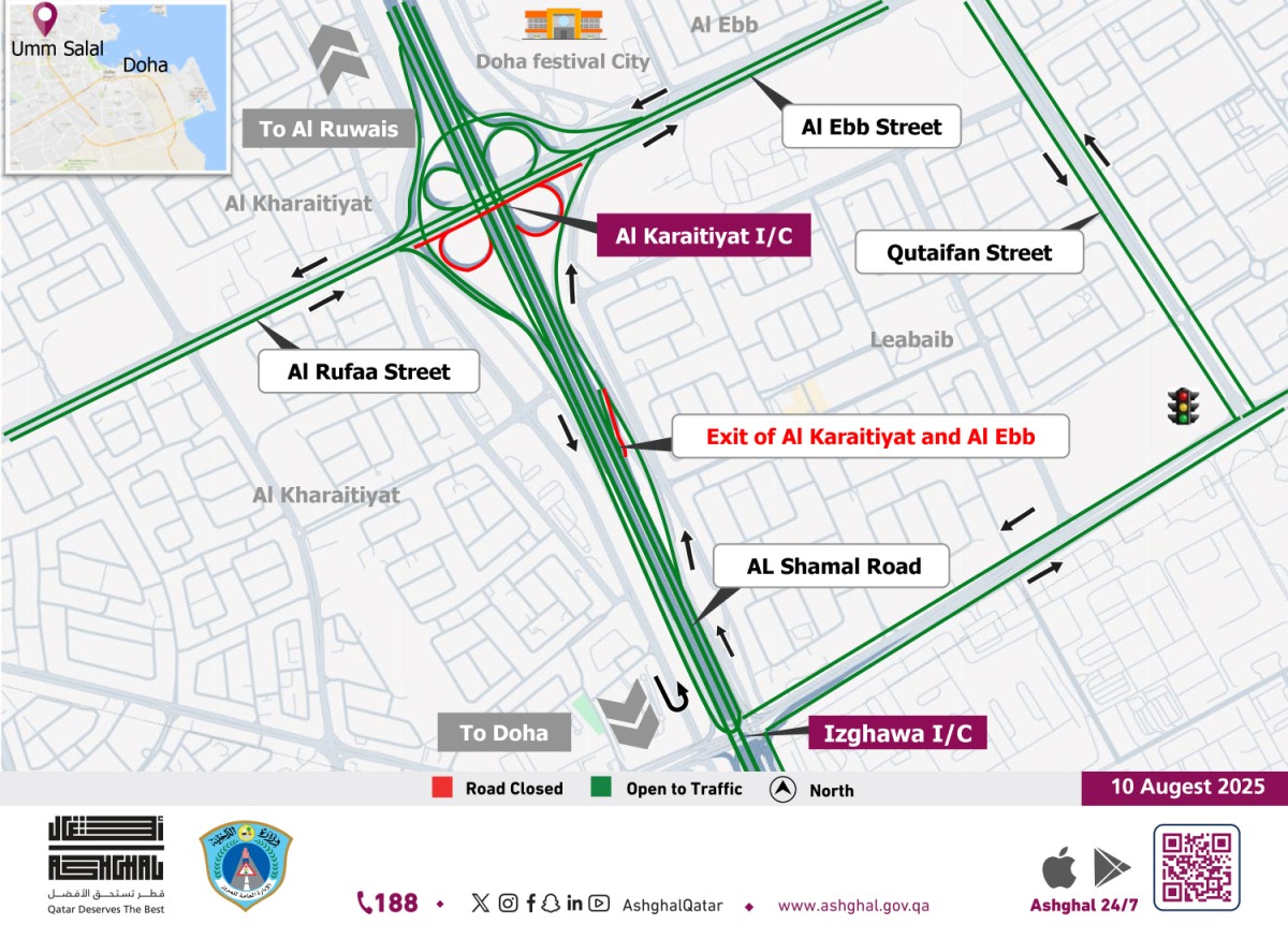 Doha, Qatar: The Public Works Authority, Ashghal, announced a partial closure on the Al Kharaitiyat Interchange for the exit leading to Al Ebb and Al Kharaitiyat, affecting traffic coming from Doha.