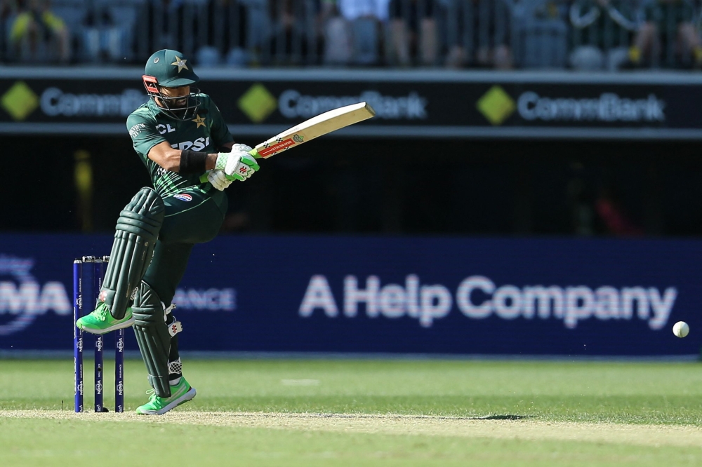 Pakistan's Babar Azam plays a shot at Perth Stadium in Perth on November 10, 2024. (Photo by David Woodley / AFP)