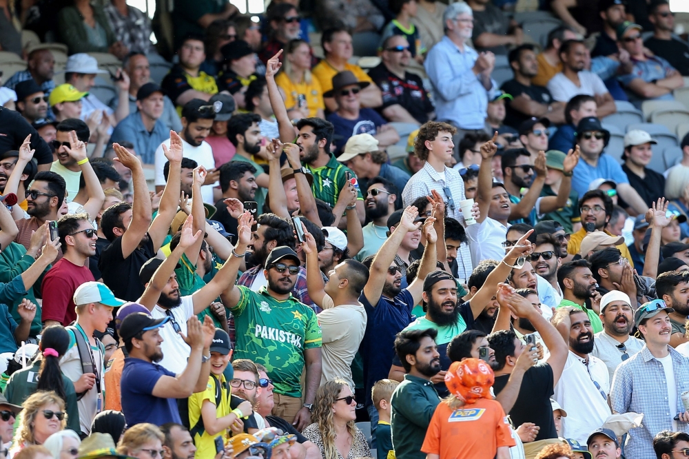 Pakistan's supporters cheer during the third one-day International (ODI) cricket match between Australia and Pakistan at Perth Stadium in Perth on November 10, 2024. (Photo by David Woodley / AFP)