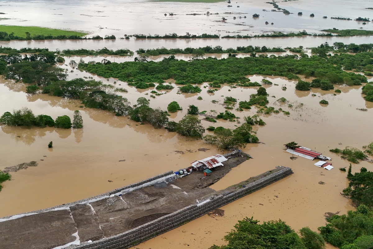 This photo shows an aerial view of flooded houses in Tuguegarao City, Cagayan province, north of Manila on November 10, 2025, after a river overflowed following heavy rains brought about by Super Typhoon Fung-wong. Photo by JOHN DIMAIN / AFP
