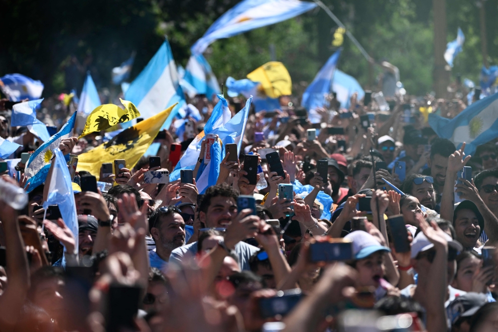 Supporters of Argentina's new president Javier Milei take picture as he greets the crowd from a balcony of the Casa Rosada government palace during his inauguration day in Buenos Aires on December 10, 2023. (Photo by Luis ROBAYO / AFP)