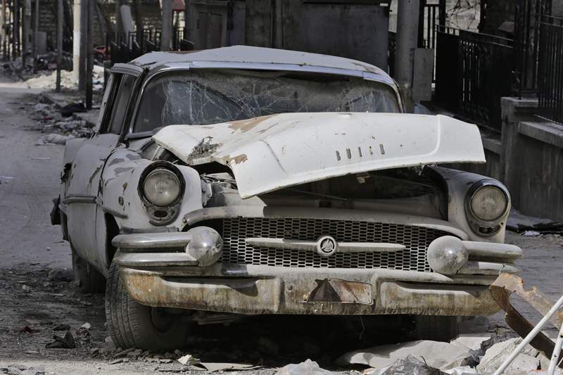 Heavy bombardment of the eastern district of Shaar had blown massive chunks of concrete off a nearby building, crushing the vintage Buick's bonnet and transforming its once-proud radiator into a twisted grimace.