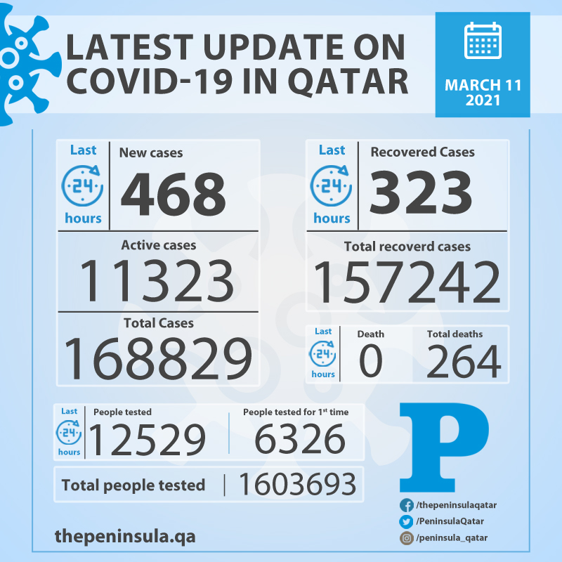 Doha: Ministry of Public Health (MoPH) today reported 468 new cases of coronavirus (Covid-19) and 323 people recovered from the virus in the last 24 hours, bringing the total number of people recovered in Qatar to 157,242.