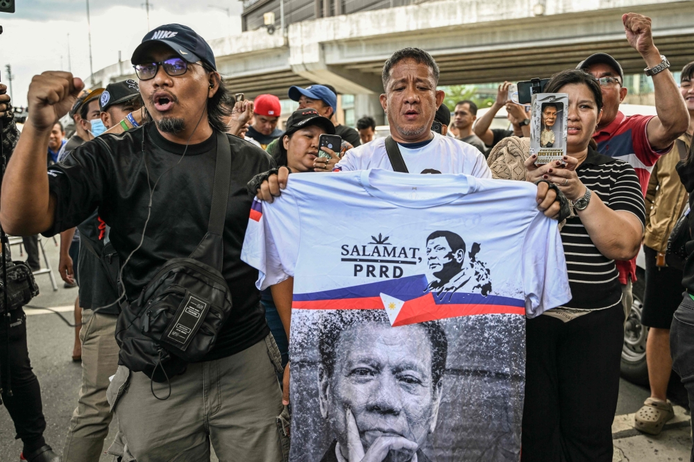 Supporters of former Philippines' president Rodrigo Duterte shout slogans as they gather outside the Villamor Air Base in Pasay, Metro Manila on March 11, 2025. (Photo by Jam Sta Rosa / AFP)