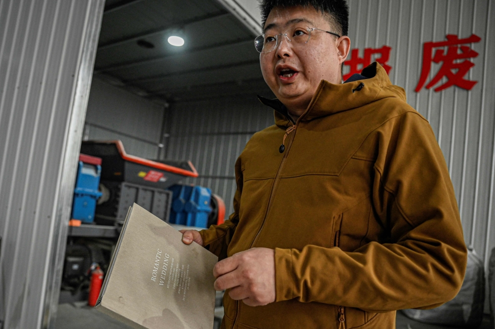 Langfang, China: At a dusty warehouse in northern China, Liu Wei feeds photos of beaming bridal couples into an industrial shredder -- turning stories of heartbreak into a source of electricity.