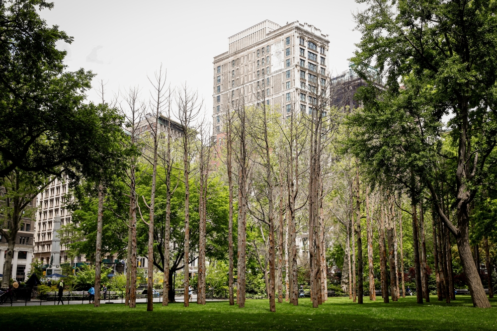 In the center of New York City's spring greenery, artist Maya Lin has installed the barren, brown trunks of 49 dead Atlantic White Cedar trees in a Manhattan park as a "Ghost Forest" to warn of the danger of climate change and the threat of rising sea water.